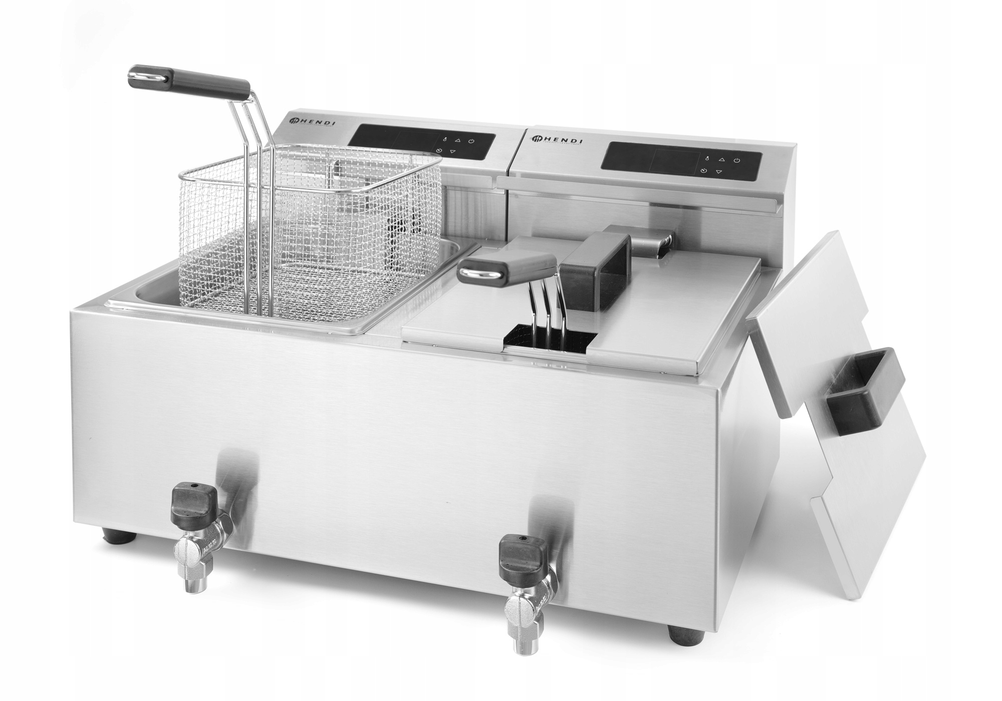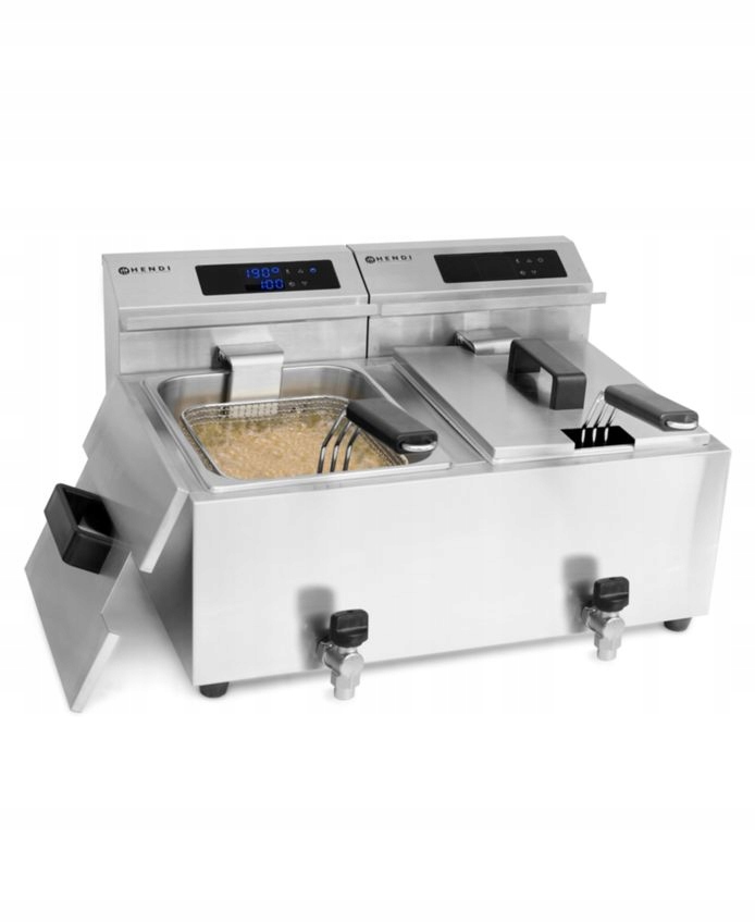 - Każda komora wyposażona w 1 kosz do smażenia i 1 pokrywę – pełne wyposażenie w zestawie.