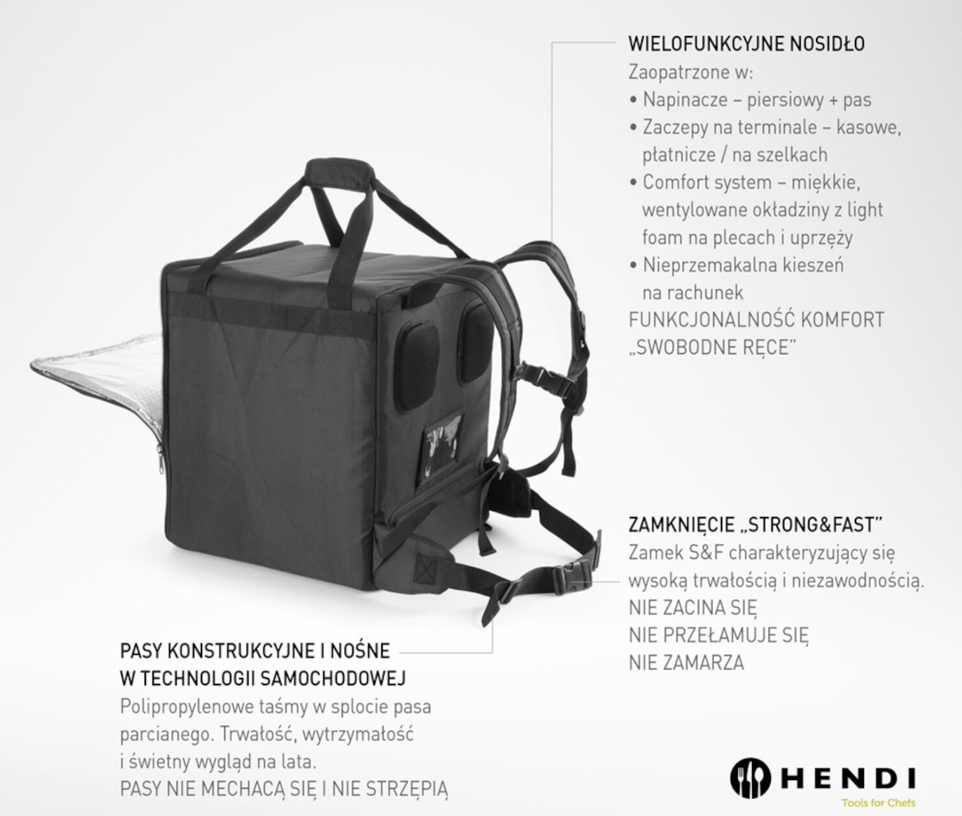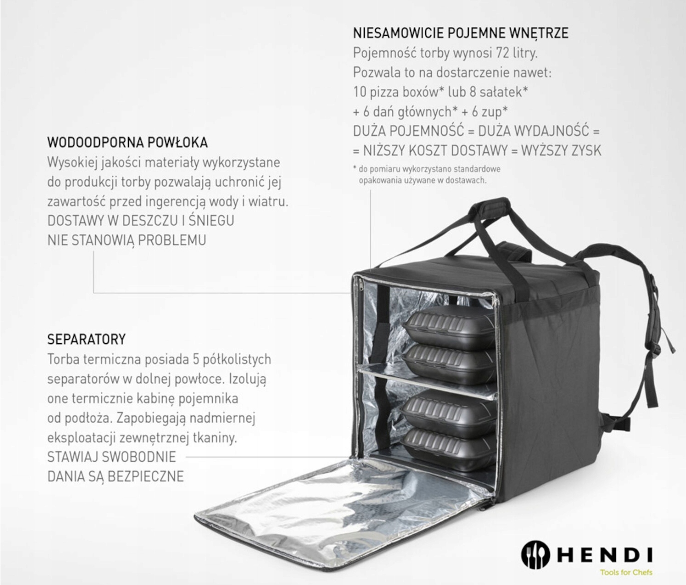 Idealny dla dostawców jedzenia: Plecak termoizolacyjny HENDI został zaprojektowany z myślą o transporcie pizzy, ciepłych dań i innych zamówień, co czyni go doskonałym wyborem dla pizzerii oraz restauracji oferujących dostawy na wynos.