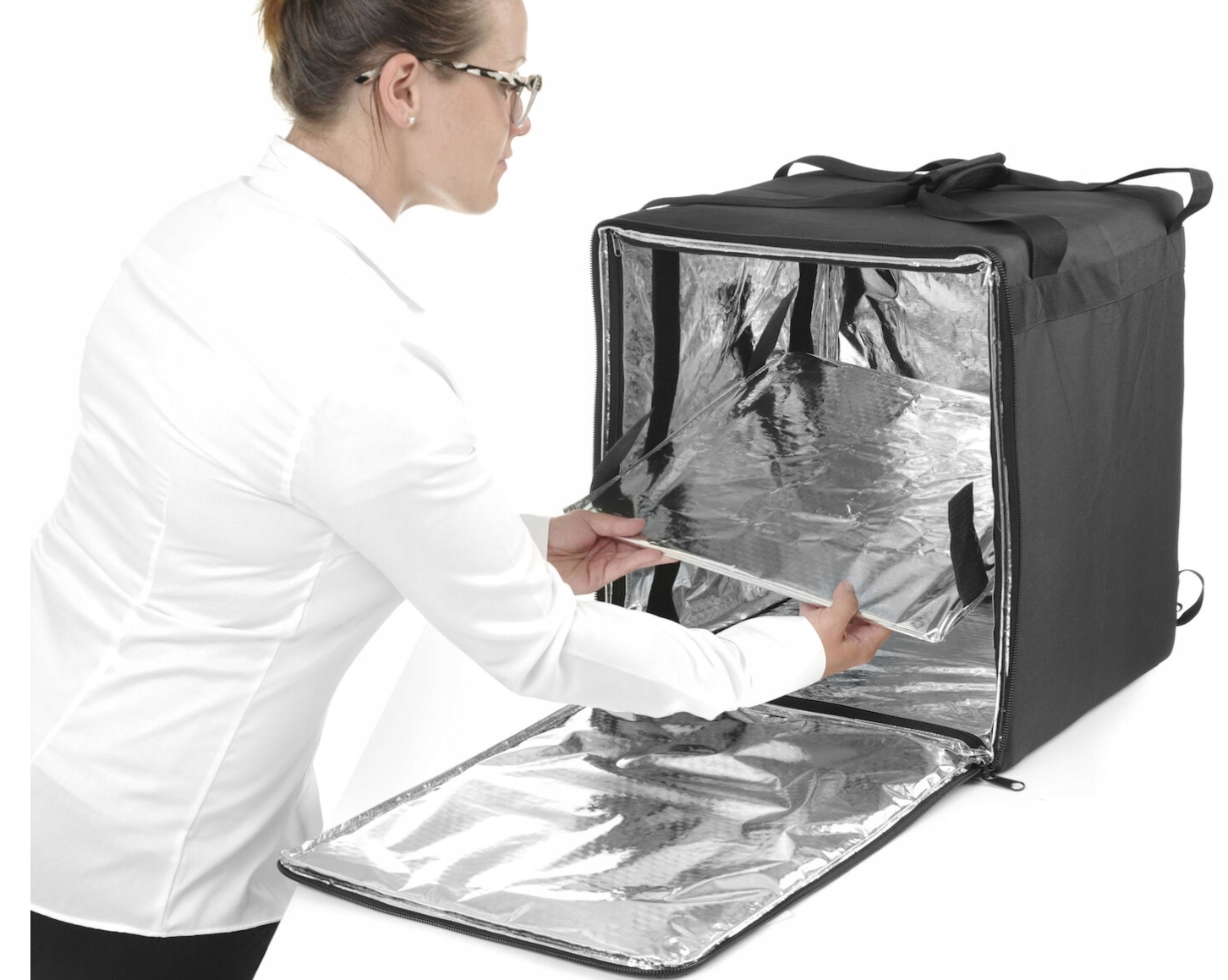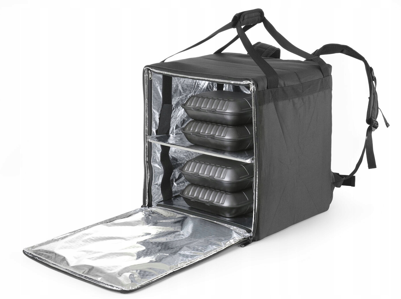 Doskonała izolacja cieplna: 2 warstwy izolacji z pianki PE i folii aluminiowej, które zapewniają utrzymanie odpowiedniej temperatury przewożonych potraw.