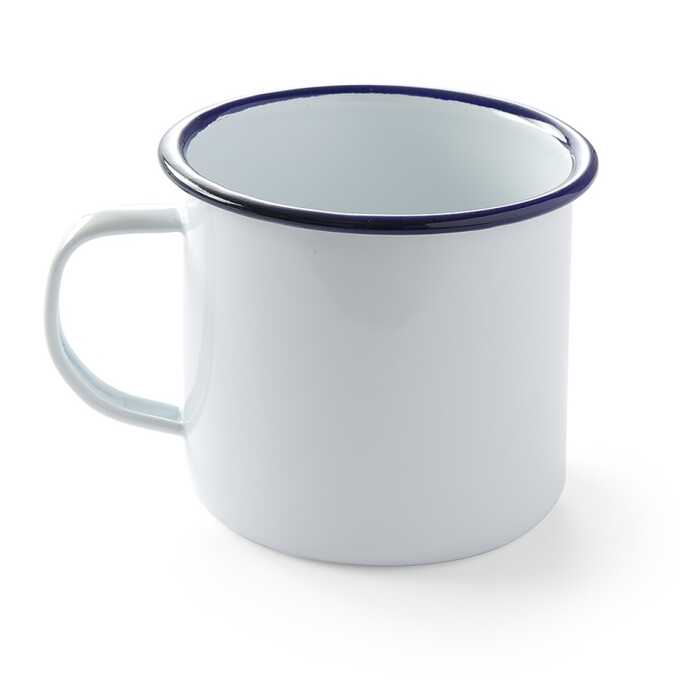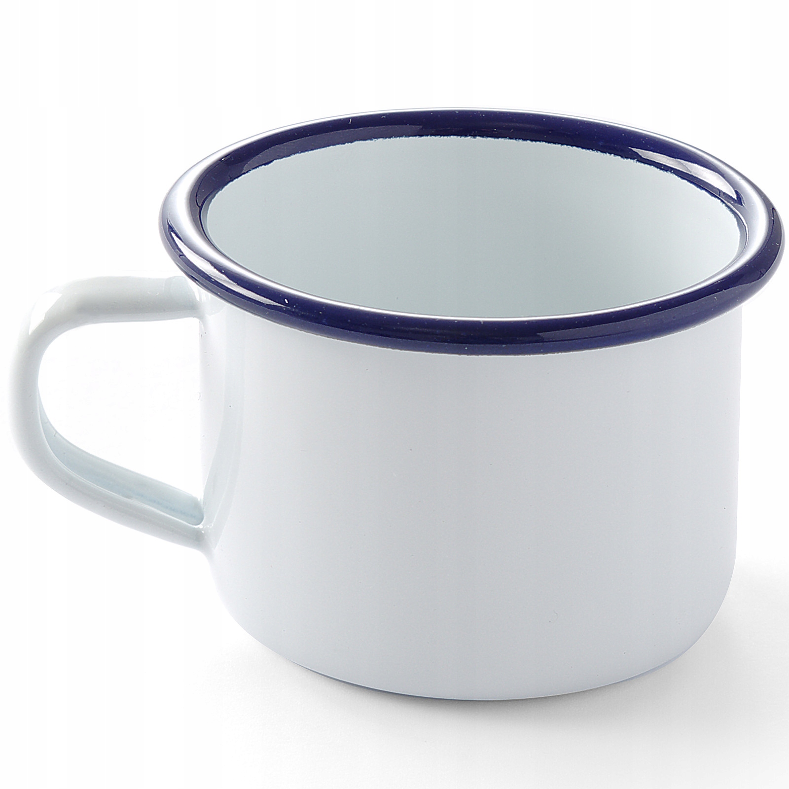 ✔ Wysokiej jakości emalia – Kubek wykonany ze stali pokrytej białą emalią z eleganckim niebieskim brzegiem. Trwała powłoka odporna na ścieranie i zarysowania.