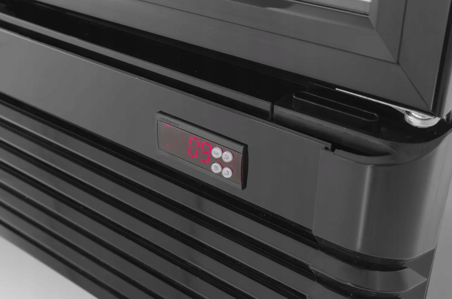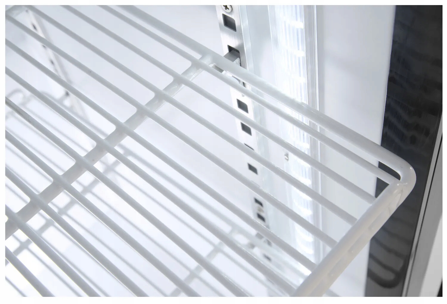 - Elegancki design: Stalowa obudowa malowana proszkowo na czarno, wnętrze komory z tłoczonego aluminium malowanego na biało, podświetlany panel LED, co zapewnia estetyczny wygląd i efektywne eksponowanie przechowywanych napojów.