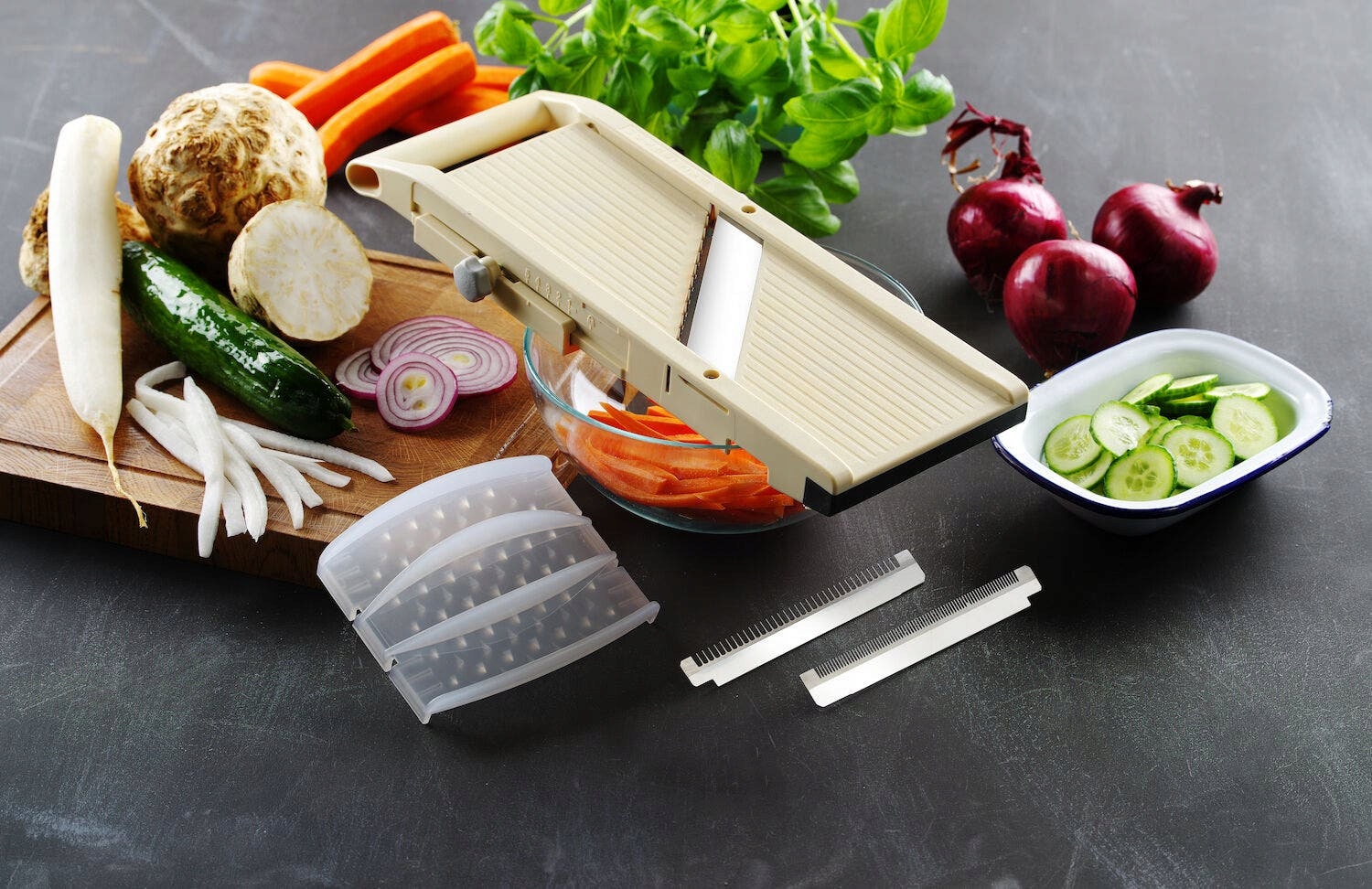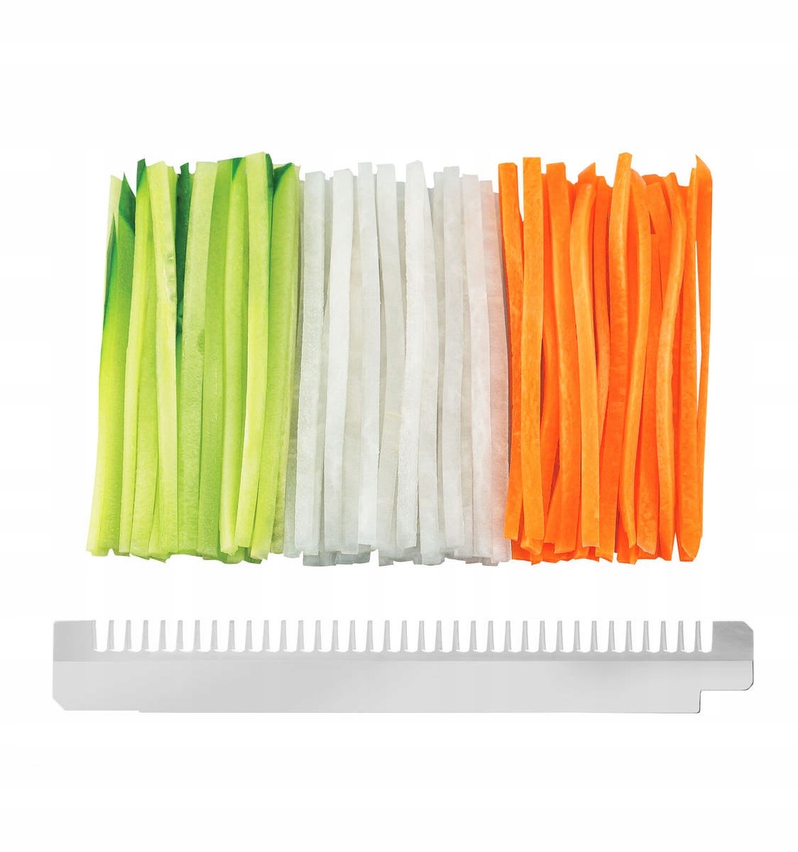 ✔ 3 wymienne ostrza julienne – krojenie w słupki o szerokości: 1 mm, 2 mm, 8 mm