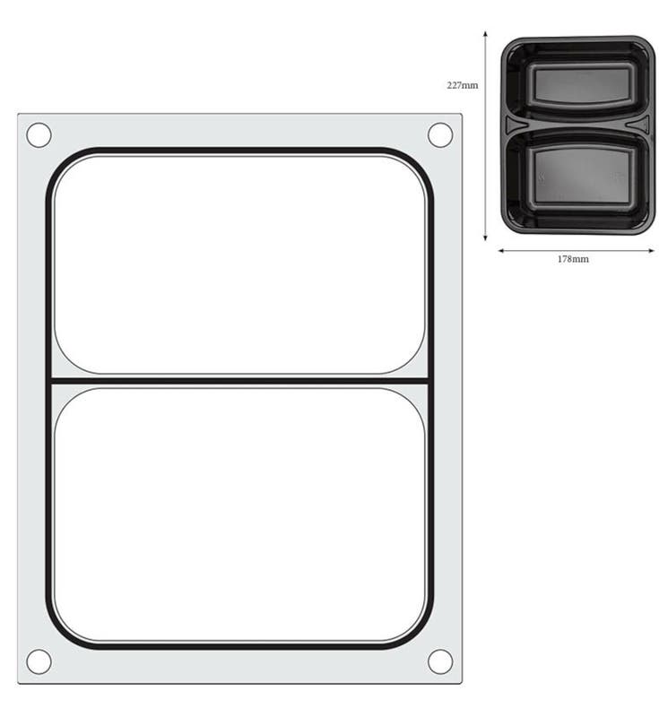 ✔ Precyzyjne dopasowanie – umożliwia szybkie i szczelne zgrzewanie pojemników dwudzielnych o wymiarach 227×178 mm, najczęściej stosowanych w gastronomii.