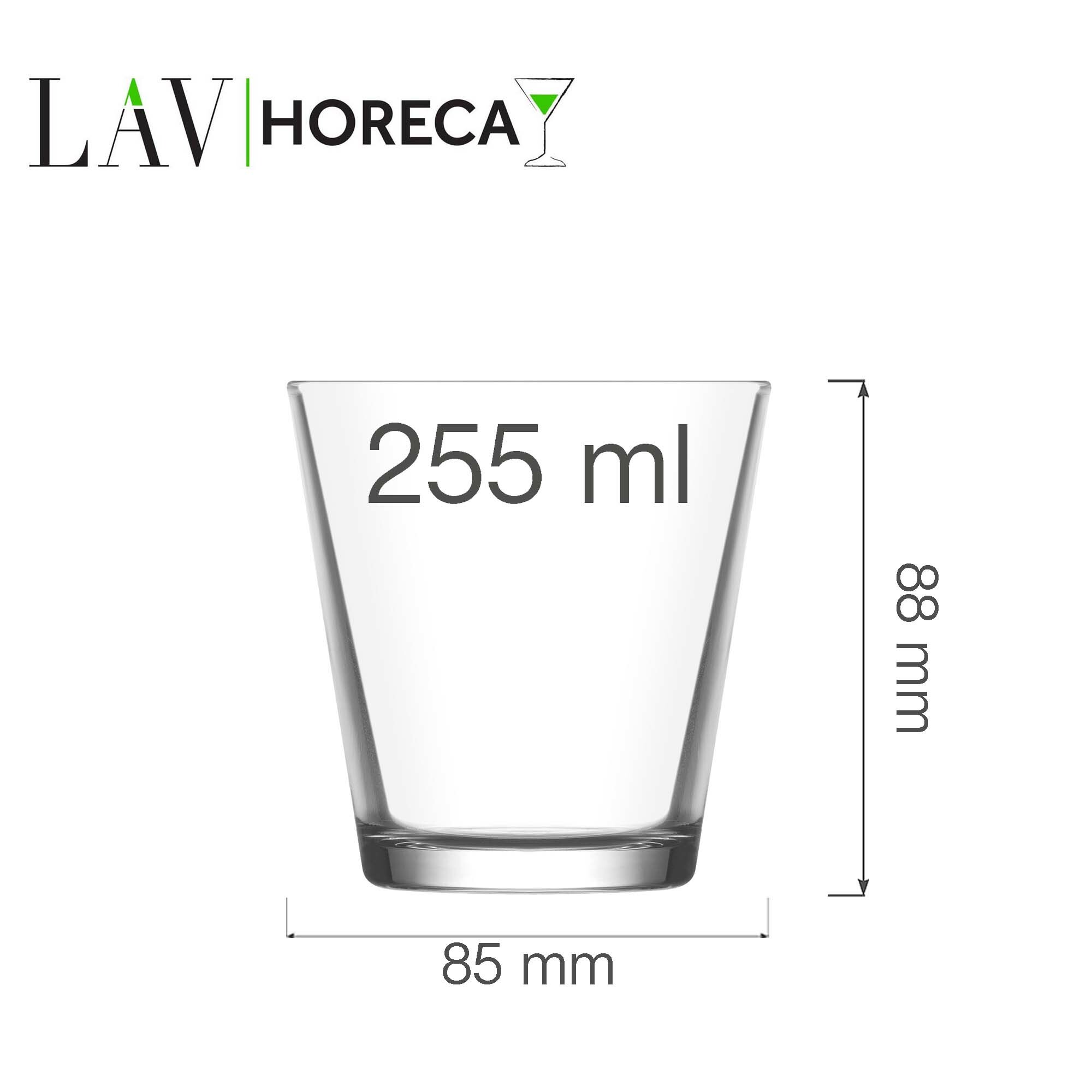 Zestaw 12 szklanek do whiskey Helsinki marki LAV, o pojemności 255 ml, to elegancki i funkcjonalny komplet stworzony z wysokiej jakości szkła. Każda szklanka ma wysokość 88 mm i średnicę 85 mm, co zapewnia wygodny chwyt i odpowiednią powierzchnię do aromatyzacji trunku. Przezroczyste szkło podkreśla barwę whiskey i pozwala w pełni cieszyć się estetyką serwowanego napoju.