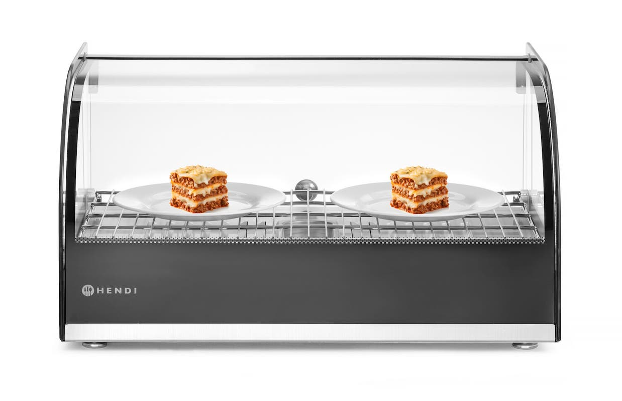 ✔ Nowoczesny design – Eleganczna, czarna witryna grzewcza marki HENDI wykonana z wysokiej jakości stali nierdzewnej oraz szkła hartowanego, idealna do prezentacji i podgrzewania potraw w restauracjach, bufetach czy kawiarniach.