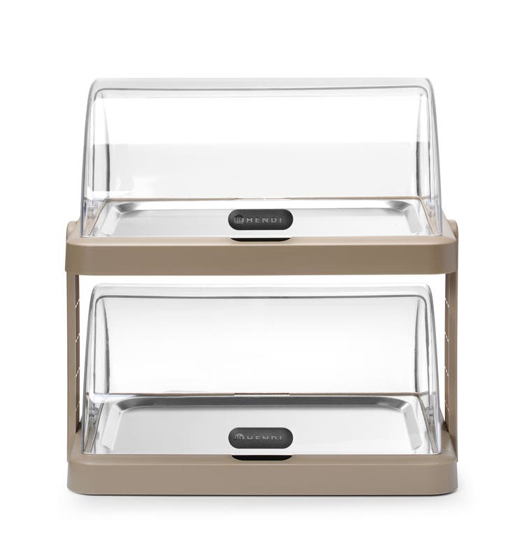 ✔ Podwójny poziom ekspozycji – pionowa konstrukcja z 2 tacami ze stali nierdzewnej (400 × 300 mm) zapewnia dwupoziomową prezentację produktów, oszczędzając miejsce na bufecie.