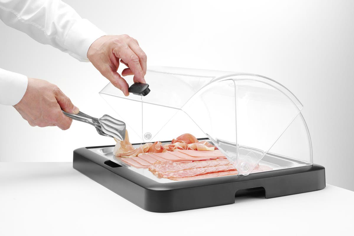 ✅ Kompletny zestaw – W komplecie znajdziesz: podstawę, pokrywę roll-top z uchwytem, tacę ze stali nierdzewnej 40 × 30 cm oraz 2 wkłady chłodzące.