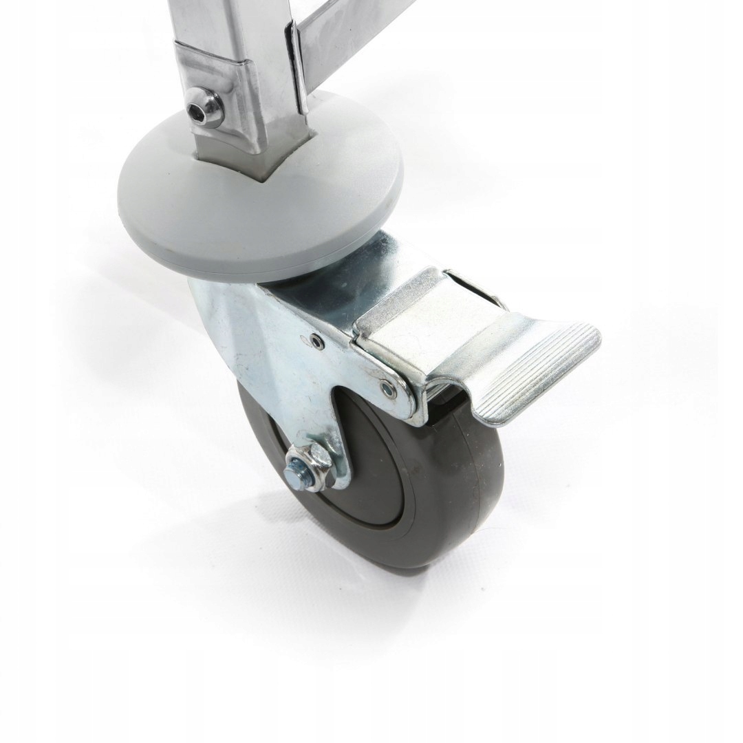 - Wygodne manewrowanie: Wyposażony w 4 skrętne kółka, z czego 2 posiadają hamulce, co ułatwia stabilizację wózka w miejscu.